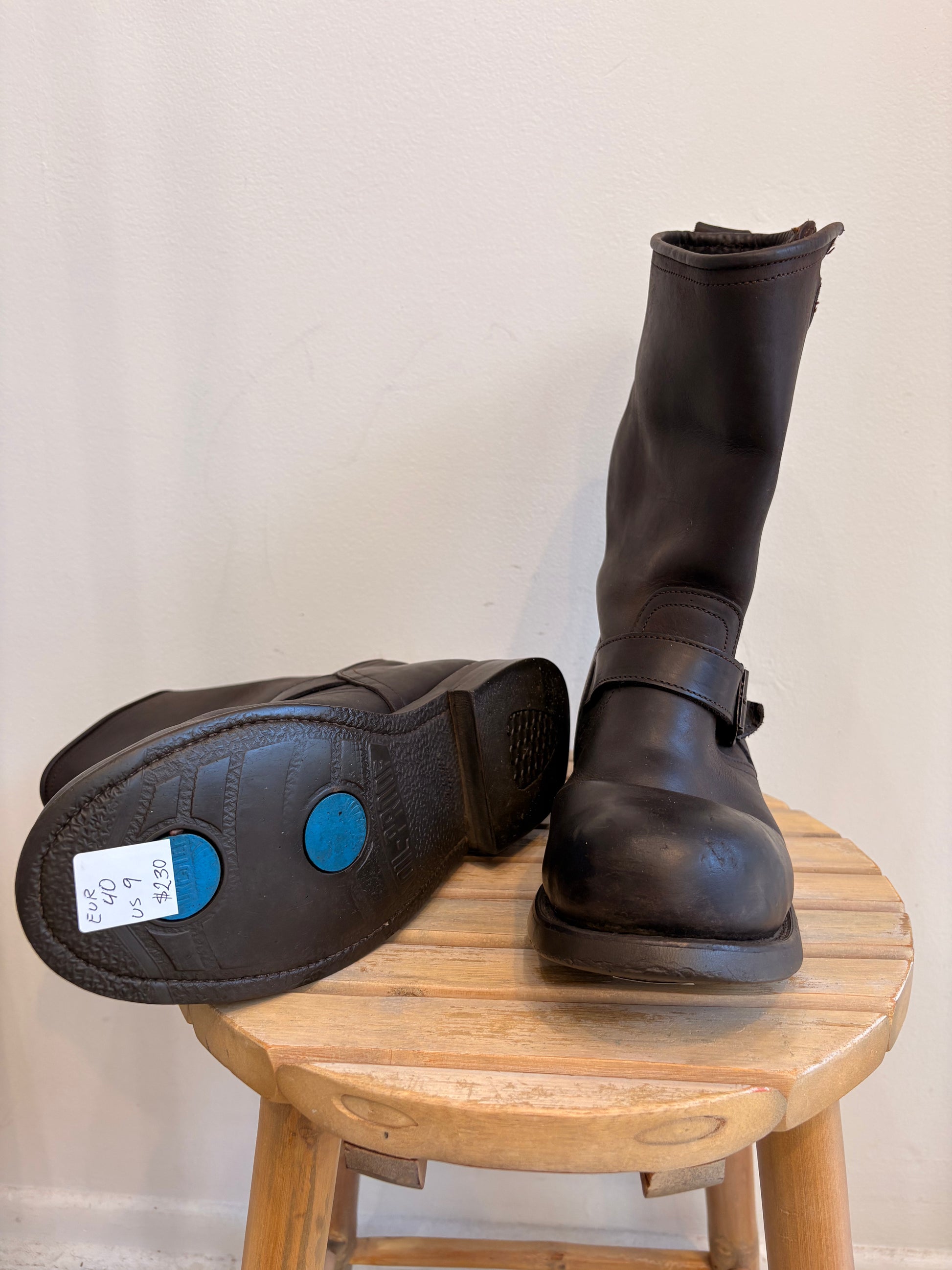 Authentic Vintage chocolate brown biker boots featuring buckle detailing and steel caps