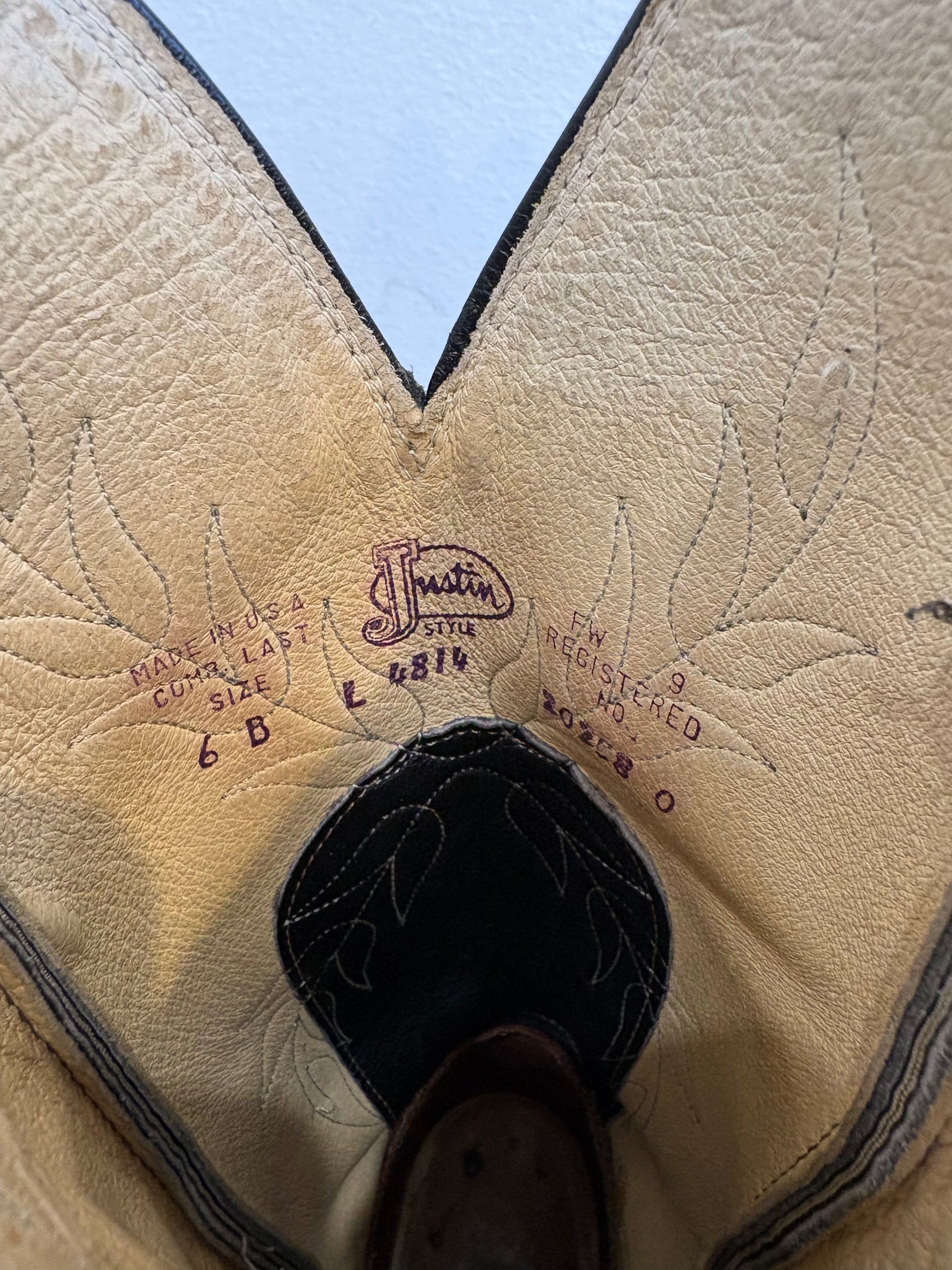 Authentic vintage black leather cowboy boots featuring a delicate white floral embroidery