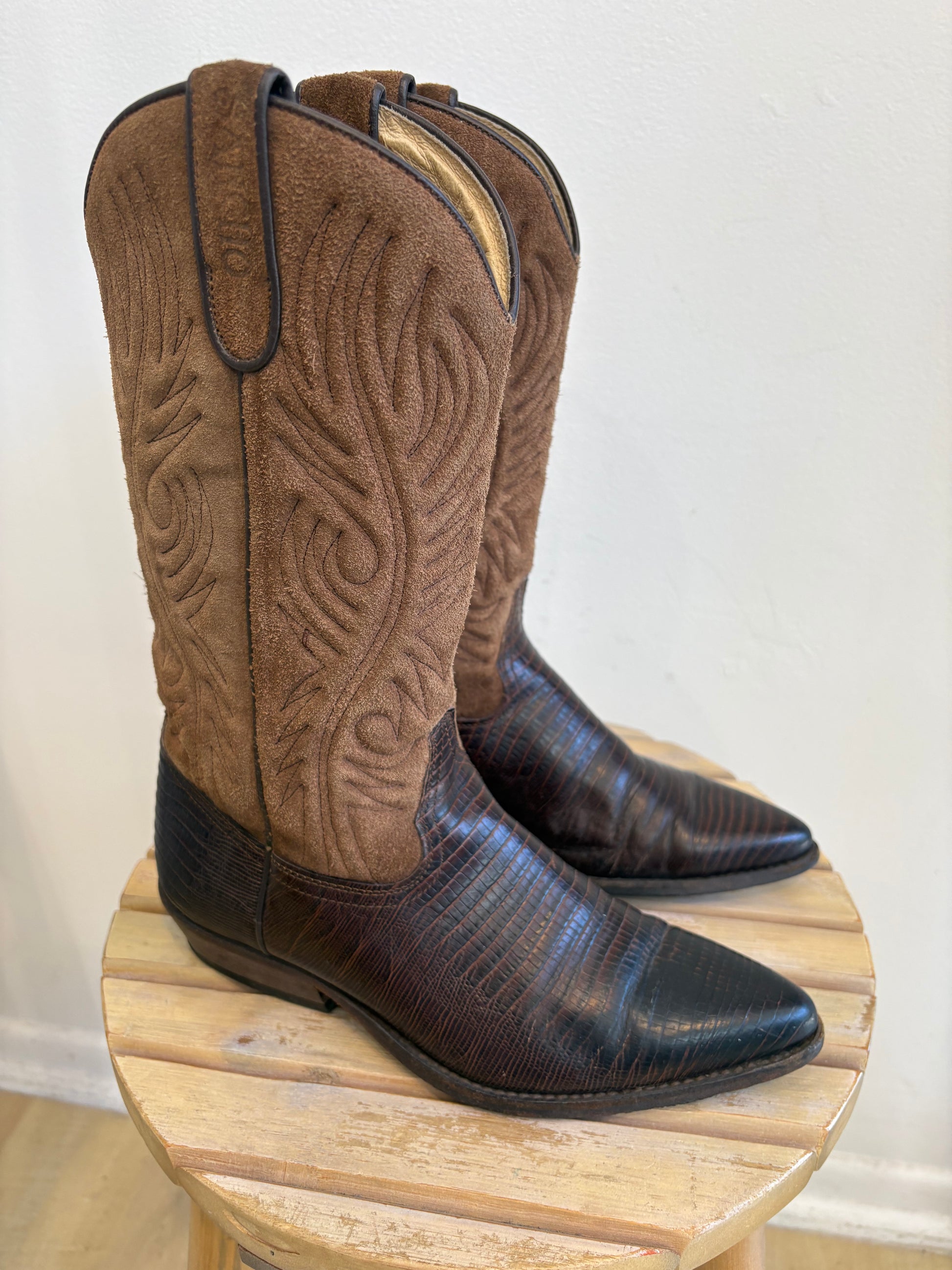 Authentic vintage Sancho half suede leather brown cowboy boots with a western vibe