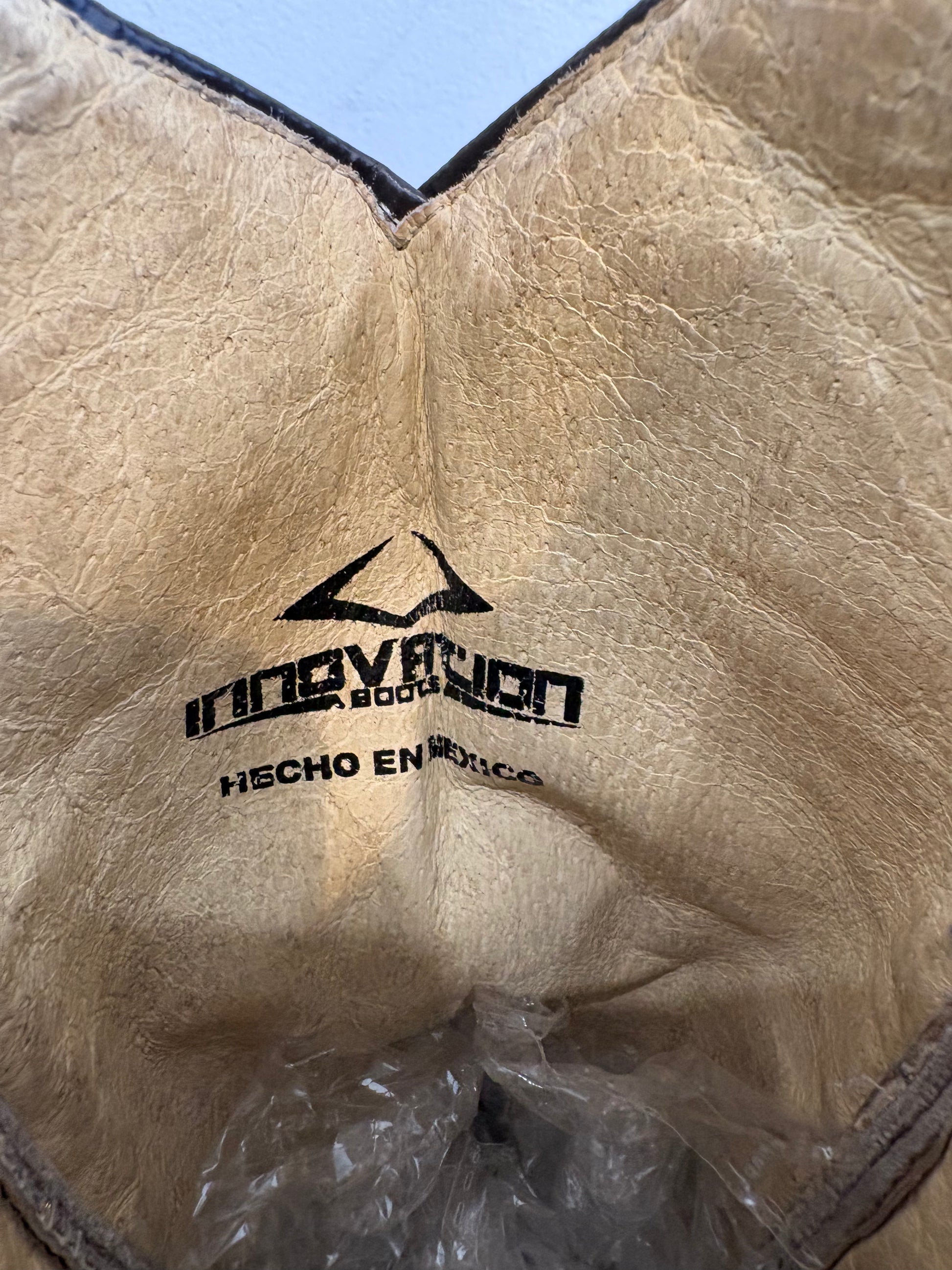 Authentic vintage tan leather cowboy boots featuring a gold sparkling wing and cross design