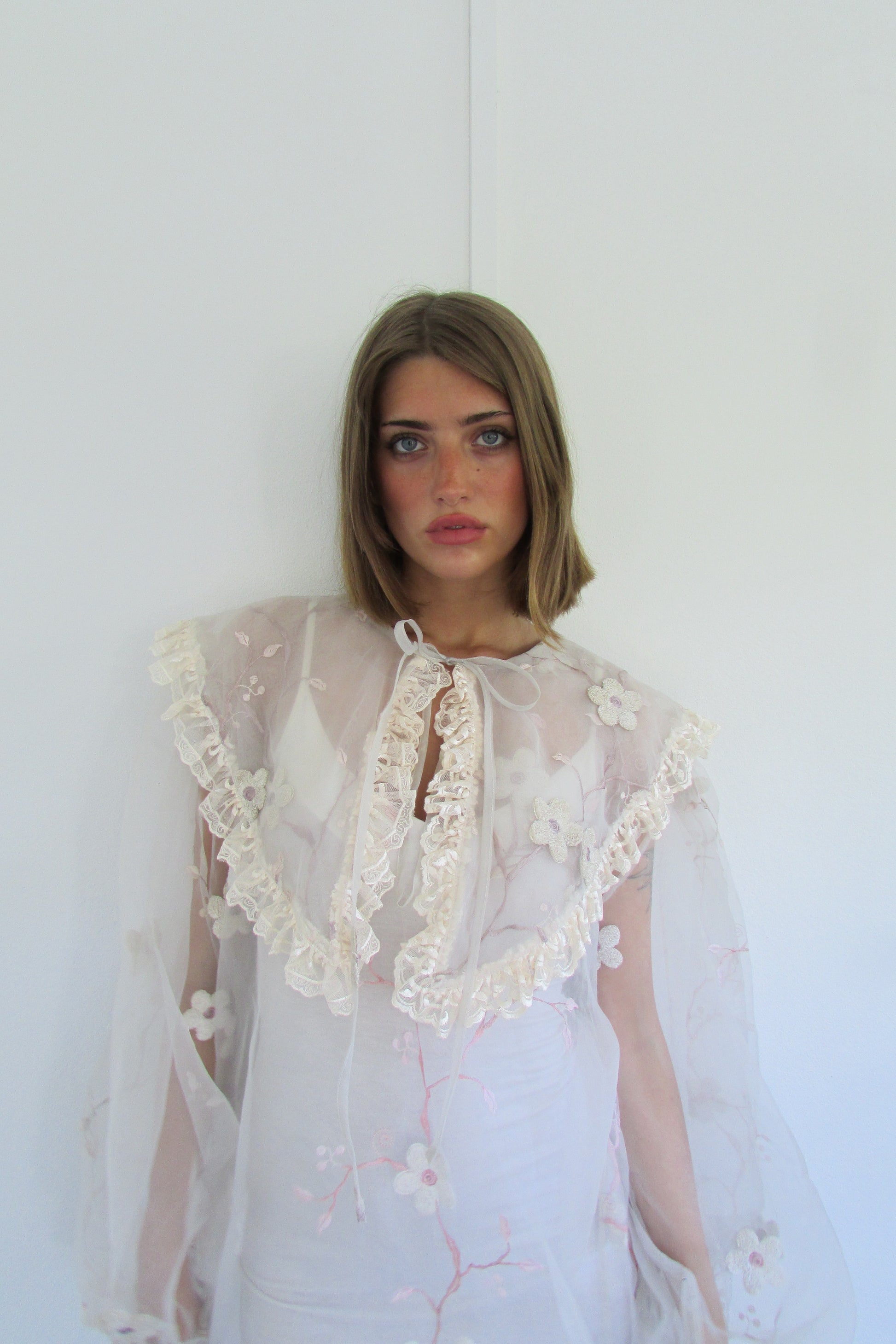 Romantic, sheer, and endlessly versatile - The Daisy Silk Dress / Top is crafted from 100% pure silk with an embroidered floral overlay. Designed to be worn as a dreamy mini dress or an elevated blouse, it features voluminous sleeves, soft lace trimming, and a floaty silhouette.