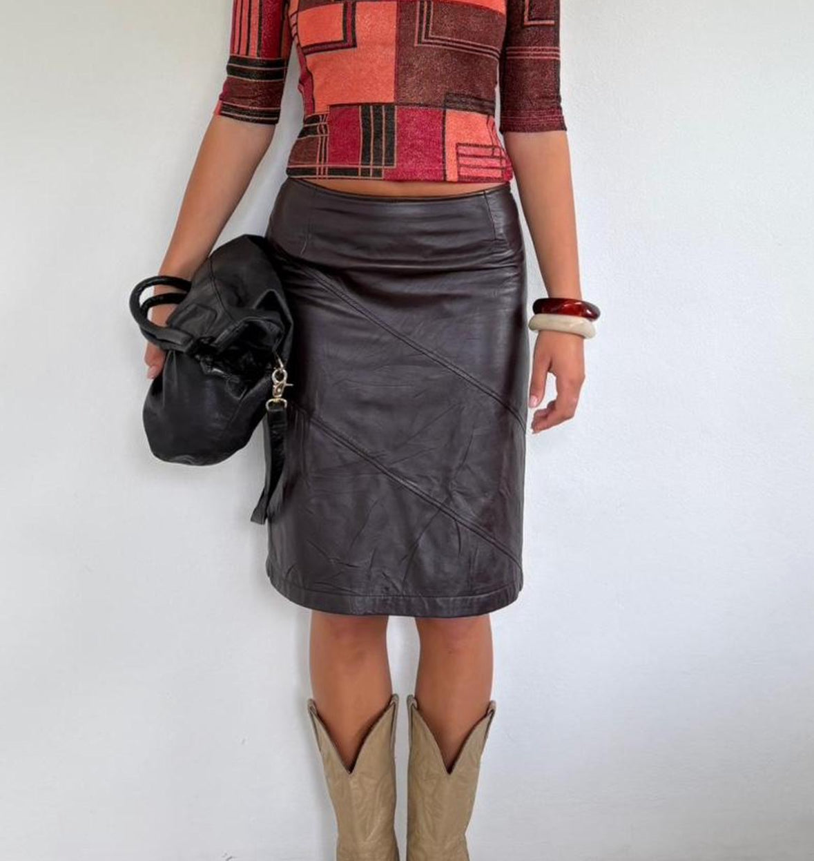 Vintage chocolate brown sheep leather skirt with zipper closure